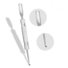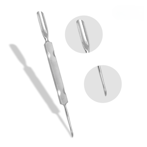 Stainless steel combo hollow pusher flat handle. It has size 9mm pusher with pointed curve scoop is to clean under and around the nails.